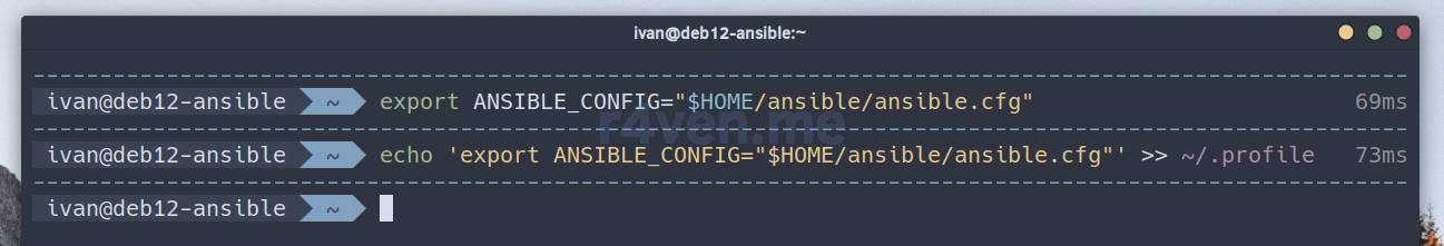 echo 'export ANSIBLE_CONFIG="$HOME/ansible/ansible.cfg"' >> ~/.profile