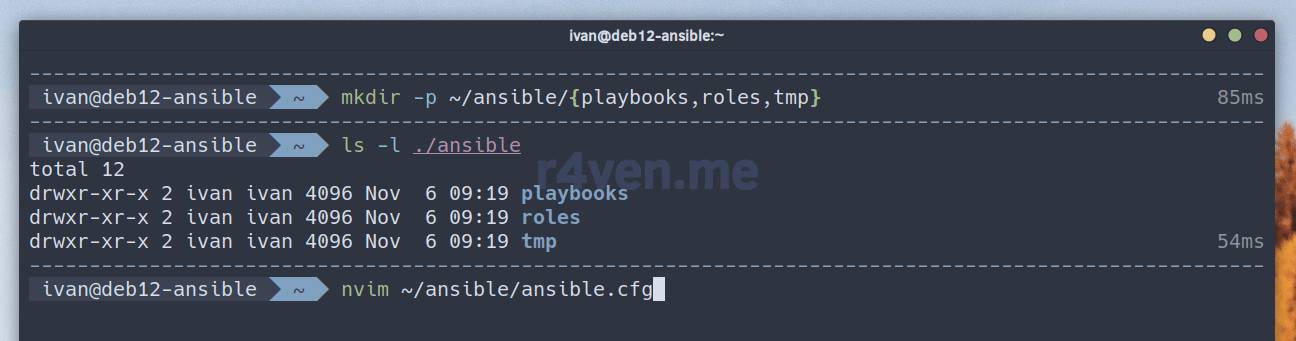 mkdir -p ~/ansible/{playbooks,roles,tmp}