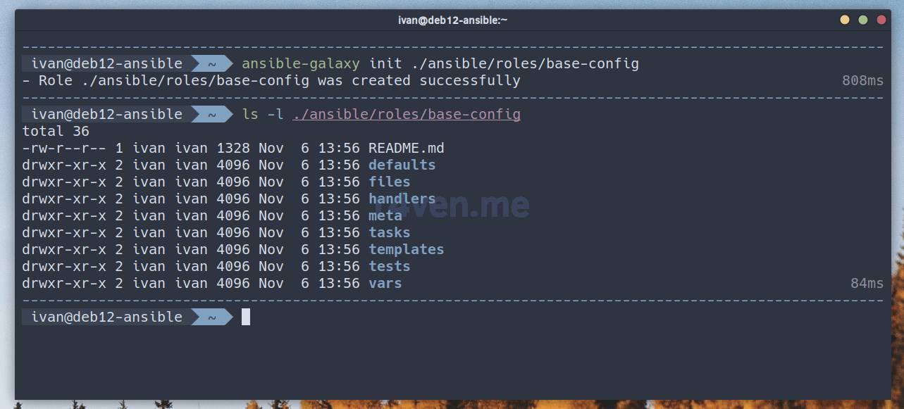 Как говорилось в начале статьи, Ansible role — это структура файлов и директорий для удобной организации задач, шаблонов, файлов переменных для Playbook🚜. Создать шаблон роли можно такой командой: