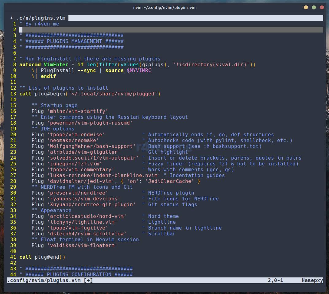 Список не маленький, но и не такой длинный, каким мог быть. Не стоит забывать, что каждый новый подключаемый плагин в своей мере нагружает редактор. Поэтому увлекаться не рекомендуется. При работе с указанными выше плагинами, я не заметил каких либо неполадок в работе Neovim. Если конечно всё встало корректно. Приступим к правке конфига.