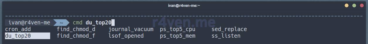 [du_top20]='du -h / 2> /dev/null | sort -rh | head -n 20'