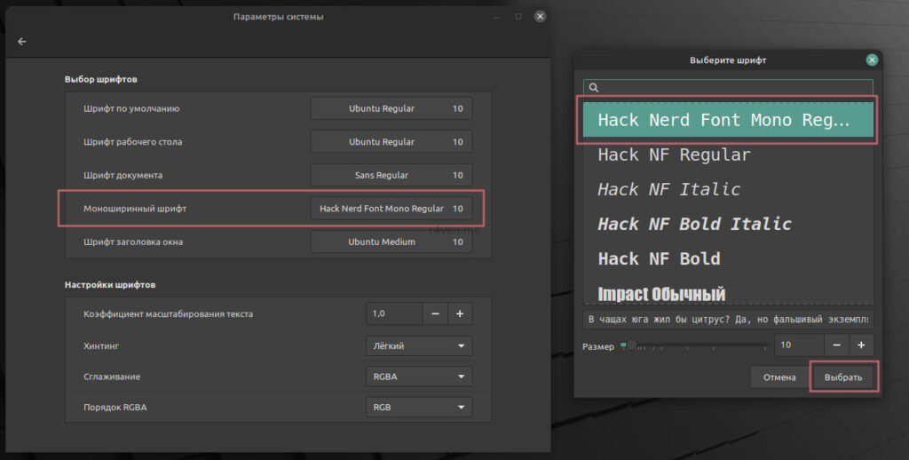- Hack — моноширный powerline шрифт Hack Nerd Font Mono для текстового редактора и терминала
