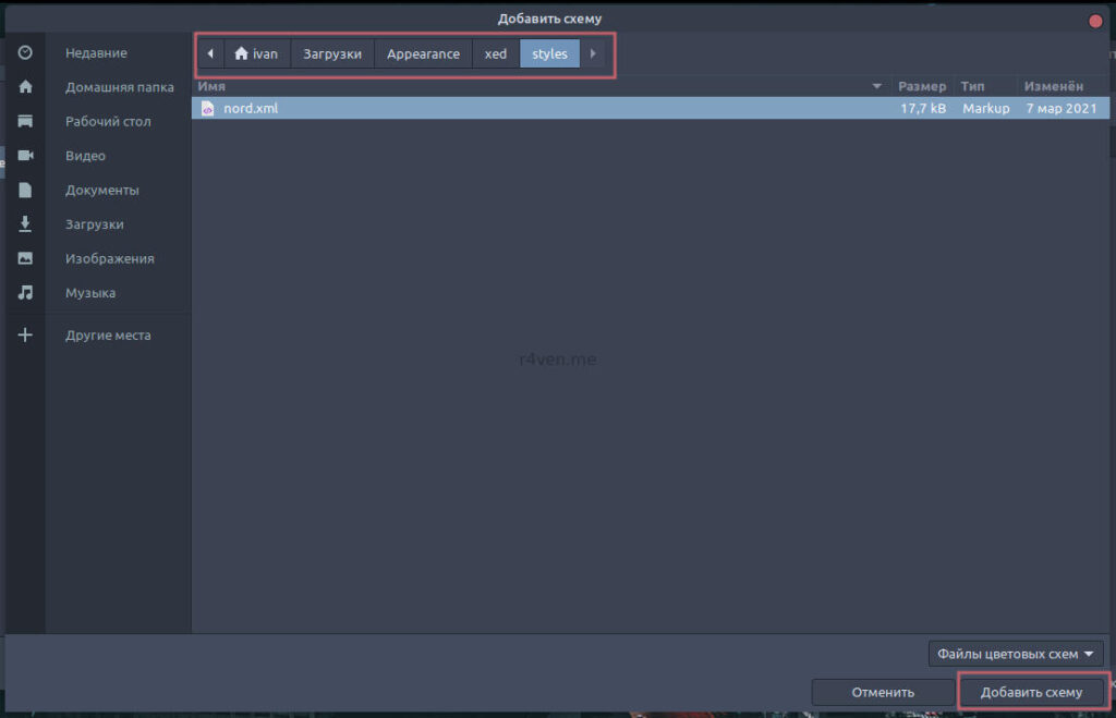 Далее идём на вкладку Оформление и нажимаем там плюсик. Теперь находим папку xed