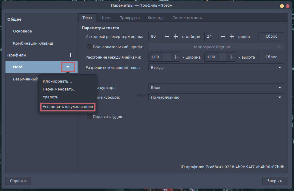 После успешной отработки команд кликаем по окну терминала правой кнопкой мыши, переходим в параметры и меняем цветовой профиль по умолчанию на Nord: