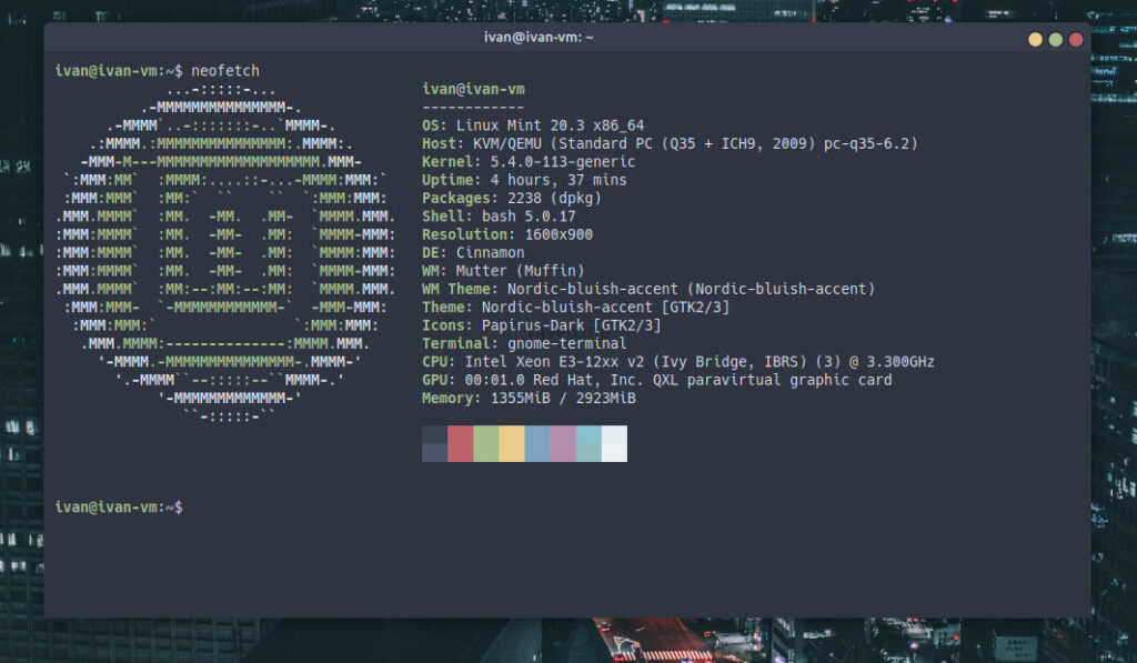 Теперь оформим наш встроенный терминал. По умолчанию, так как Linux Mint основан на Ubuntu, а рабочее окружение Cinnamon работает на Gnome shell, в системе используется терминал от рабочей среды Gnome. В плане настроек он не слишком богат, но свою задачу выполняет на отлично. С его помощью мы и скачаем, затем активируем официально поддерживаемую тему Nord для него. Тут нам понадобится скачанная ранее программа git. Выполняем поочередно две команды: