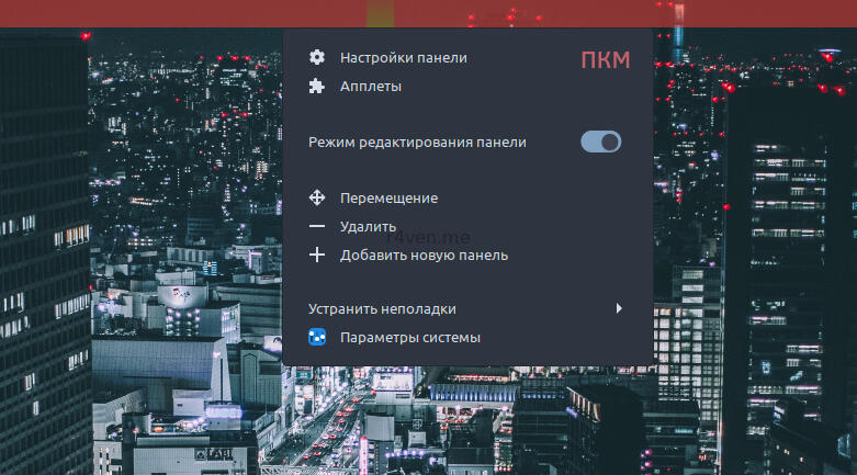 И вновь ПКМ по панели, но теперь нажимаем на переключатель Редактировать панель и мышкой передвигаем справой части апплеты время и погода на центральную часть, а Переключатель рабочих столов на левую часть. Должно получится вот так: