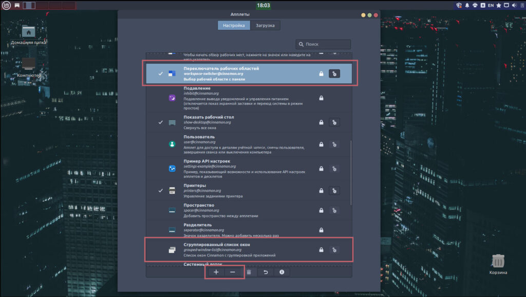 Теперь вновь ПКМ по панели и нажимаем Апплеты. После отключаем Сгруппированный список окон нажатием на минус и активируем Переключатель рабочего стола нажатием плюсика.