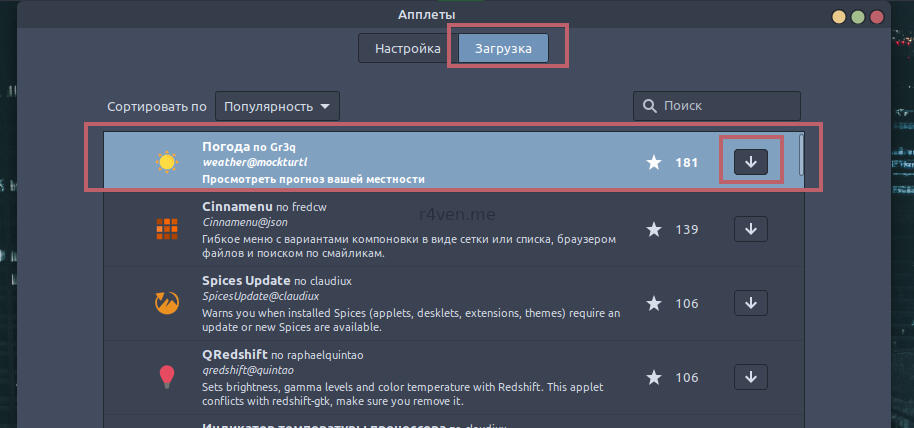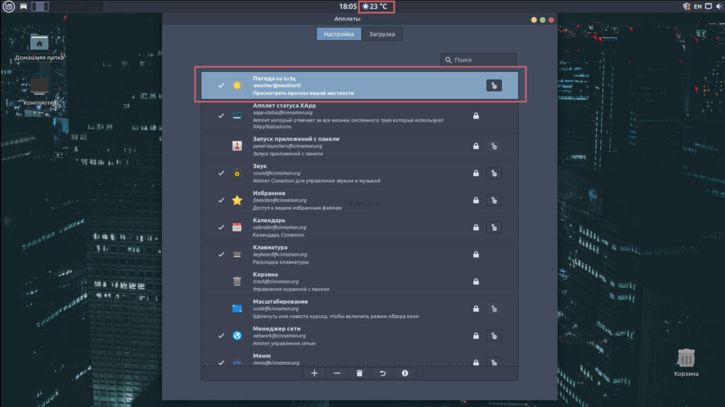 Затем переходим на вкладку Загрузка, чтобы скачать апплет погоды для нашей панели. После чего, в соседней вкладке активируем его отображение на панели, как предыдущие апплеты: