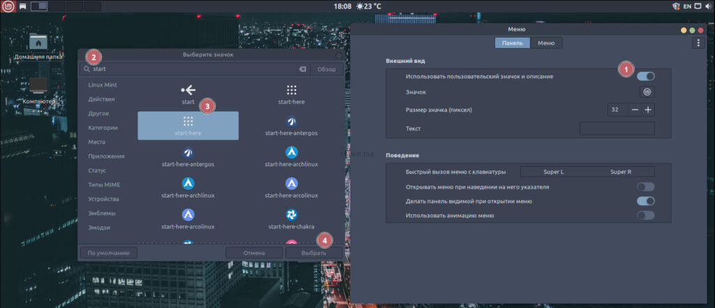 На следующем шаге я обычно меняю стандартную иконку главного меню Linux Mint на системную иконку меню. Это необязательно, но мне так больше нравится: