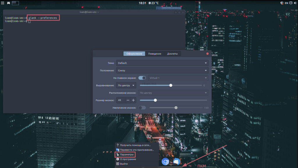 Попасть в раздел настроек док-панели не так просто 😉 Для этого нужно нажать ПКМ на самой панели, но всегда это удаётся в силу малого пространства для этой манипуляции. Вместо этого можно вызвать данное меню из терминала, выполнив plank --preferences
