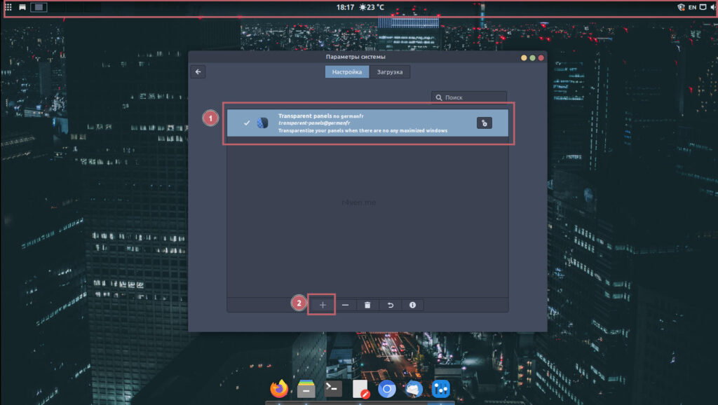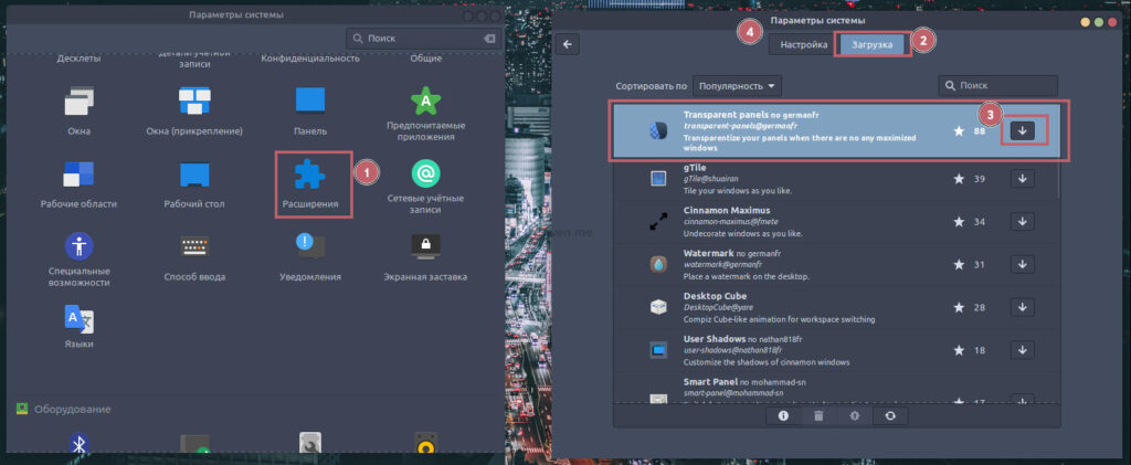 Это также опционально. Лично мне по душе. Для этого идем в настройки системы в раздел Расширения. Скачиваем и активируем расширение прозрачности панели (Transparent panels). Обычно оно первое в списке. Активируем его: