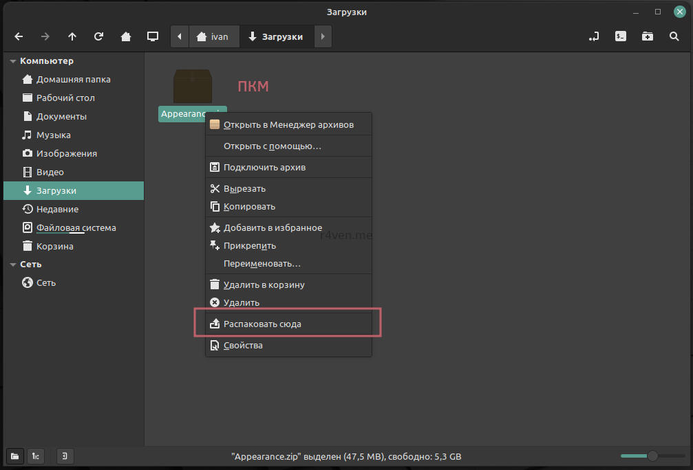 Распаковываем его и открываем распакованную папку от имени root с помощью ПКМ по ней.