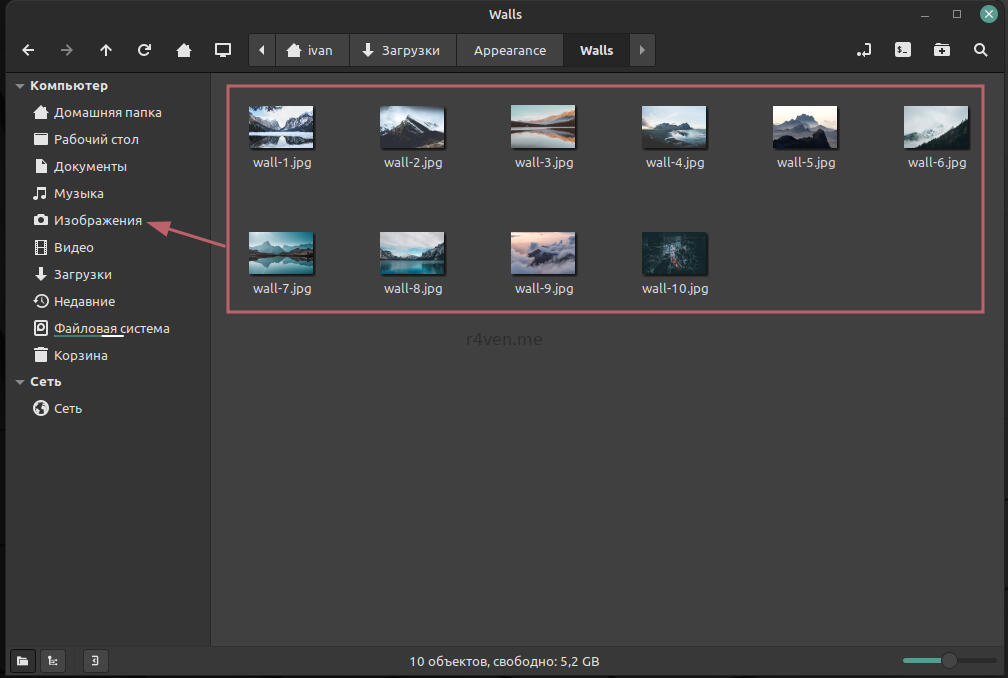 Окно файлового менеджера, запущенного от root пользователя можем закрывать, переходим в обычное окно и копируем содержимое папки Walls в папку Изображения