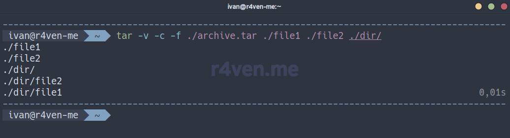 tar -c -f ./archive.tar ./file1 ./file2 ./dir/