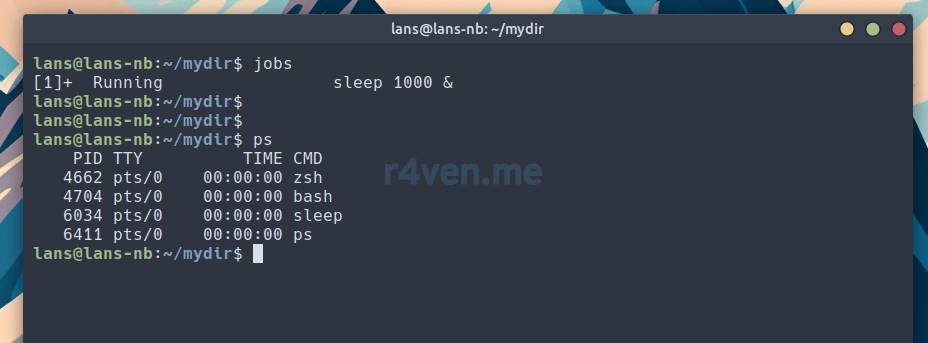 После отправки процесса в фоновое исполнение в терминал выводится номер процесса в локальной оболочке jobs id — [1] и номер (PID — process id) в общем системном списке — 6034.