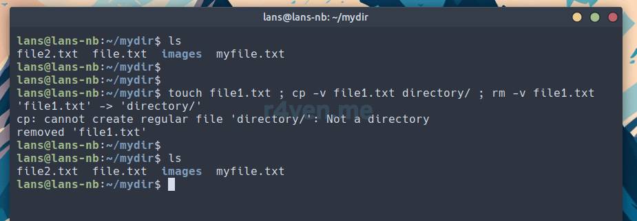 мы выполняем переход в созданную ранее директорию «mydir», затем файл «file1.txt» копируется в файл «file2.txt». Если операция копирования успешна, то с помощью команды rm