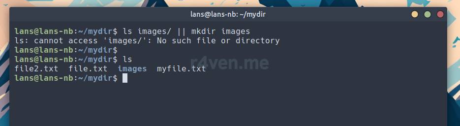 выводится сообщение «Файл не найден». После создаётся файл «file.txt» с содержимым «Hello R4ven» и вновь выполняется предыдущая команда — результат выполнения изменился, блок после ||