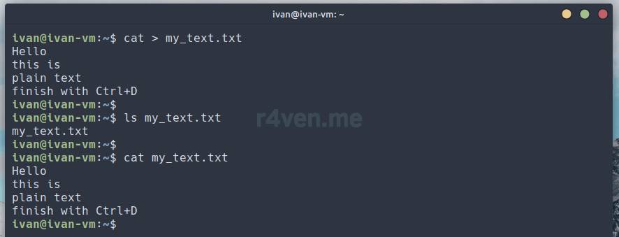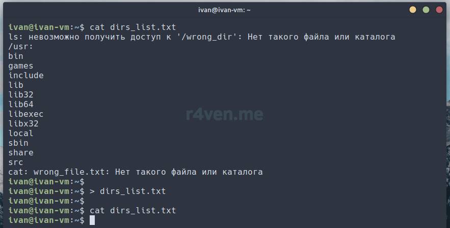 перезаписывает файл, если он существует! Поэтому с ним нужно быть осторожнее. Для наглядности перенаправим вывод другой команды в тот же файл и проверим его содержимое. Выполним команды: