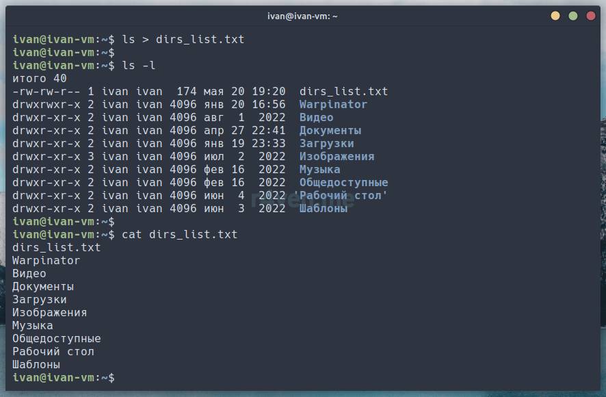 Обратите внимание на один момент: файл созданный нами в результате нашей команды перенаправления содержит в списке в том числе и наш новый файл dirs_list.txt. Т.е. файл был создан перед выполнением самого перенаправления и поэтому попал в список.