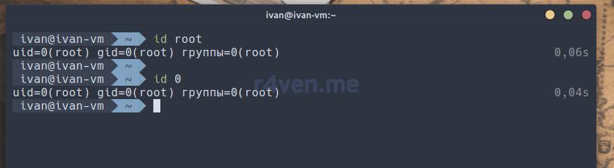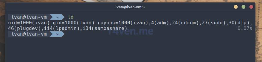 Так как система прав на файлы в Linux подразумевает взаимодействие с такими сущностями, как владелец и группа владельцев, давайте изучим команду id