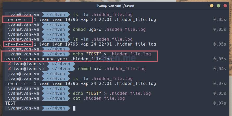 Теперь давайте уберем для всех атрибут записи со скрытого файла .hidden_file.log