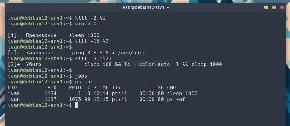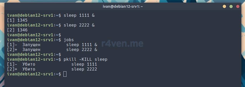 Первой командой мы отправили SIGINT процессу с номером 1 в текущей сессии, второй командой сигнал SIGTERM второму локальному процессу и третьей командой мы отправили SIGKILL третьему локальному процессу, но с указанием его PID.