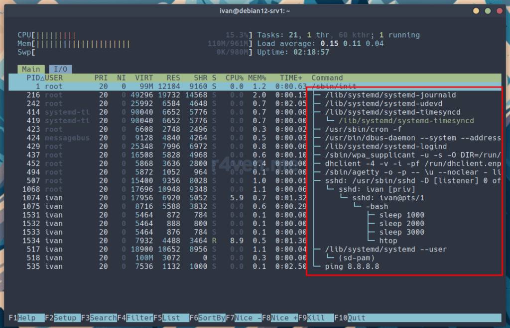 клавиш (смотрите подсказки внизу окна htop