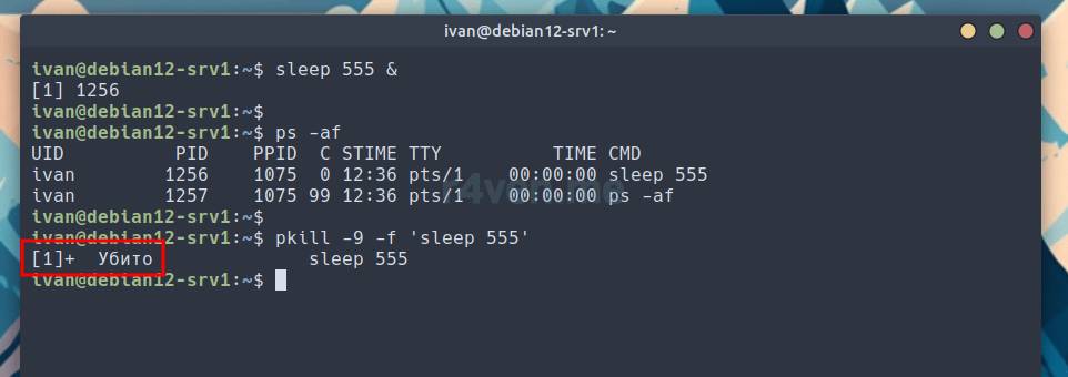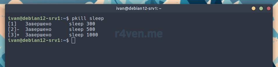 Как видно, команда нашла все процессы, в имени которых присутствует ключевое слово «sleep» и завершила их.