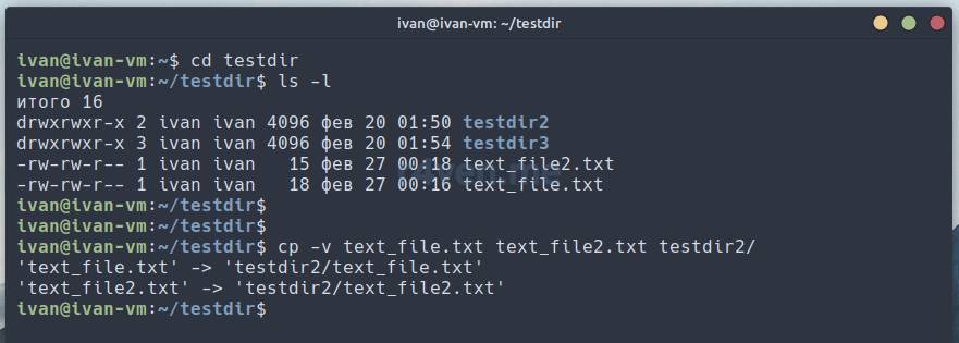 Теперь давайте создадим и скопируем файл text_file2.txt в директорию testdir используя ключ -v