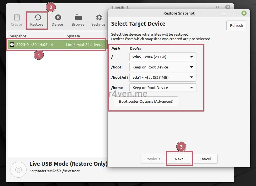 Если ваша ОС не загружается вовсе, необходимо запуститься с usb флешки с LiveCD образом Linux Mint и уже там запустить утилиту Timeshift в графическом режиме. Как создать такую флешку я рассказывал в статье: Установка Linux рядом с Windows.