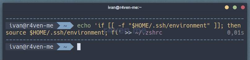 echo 'if [[ -f "$HOME/.ssh/environment" ]]; then source $HOME/.ssh/environment; fi' >> ~/.zshrc
