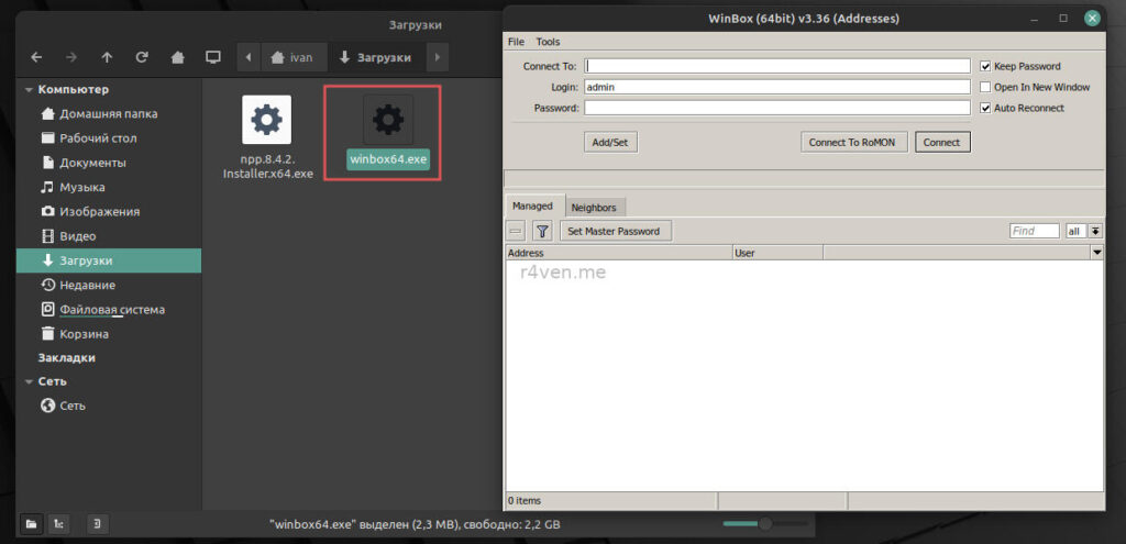 Пример с запуском приложения для работы с роутерами Mikrotik — winbox: