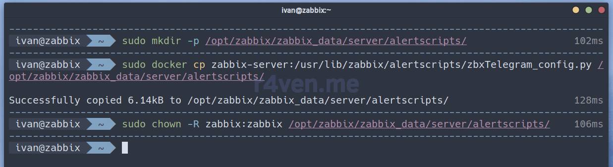 После запуска создаем папку скриптов алармов, из докер контейнера zabbix-server копируем туда конфиг файл скрипта отправки уведомлений в телегу и меняем его владельца: