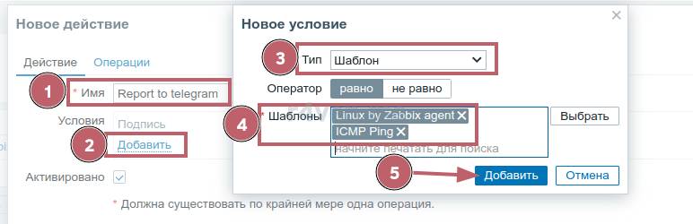 Указываем адресата — нашего сервисного пользователя, у которого прописывали ID группы/чата в телеге. Тут же указываем способ отправки: тот, что мы создали ранее: