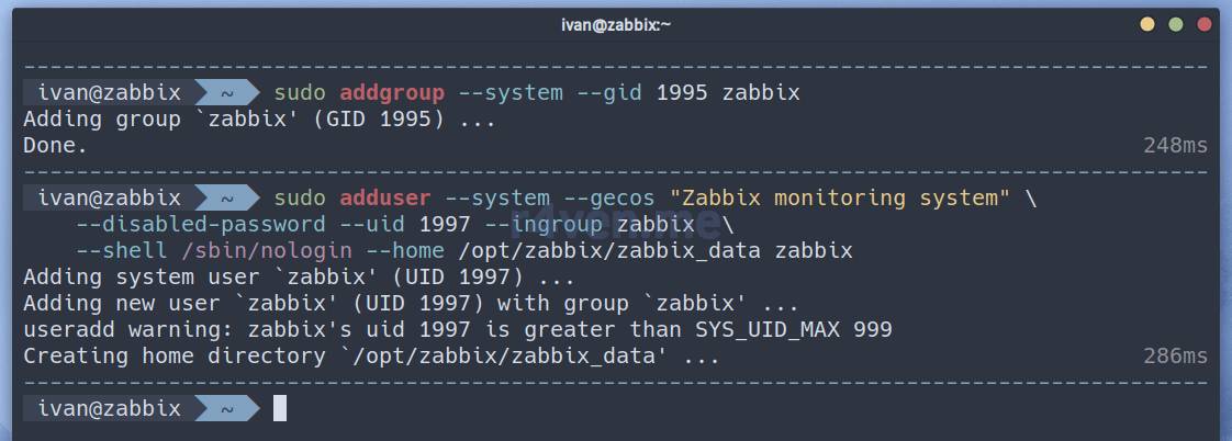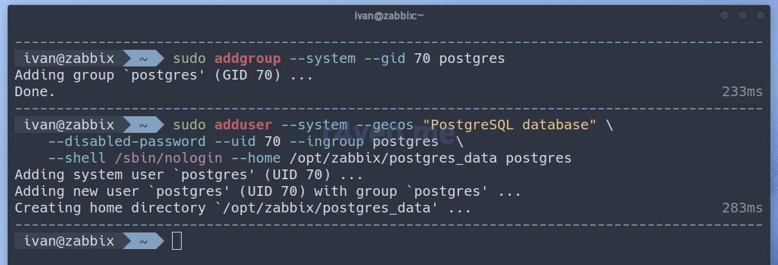 В целях безопасности создаем ограниченные в правах группу и сервисного пользователя для запуска контейнеров zabbix: