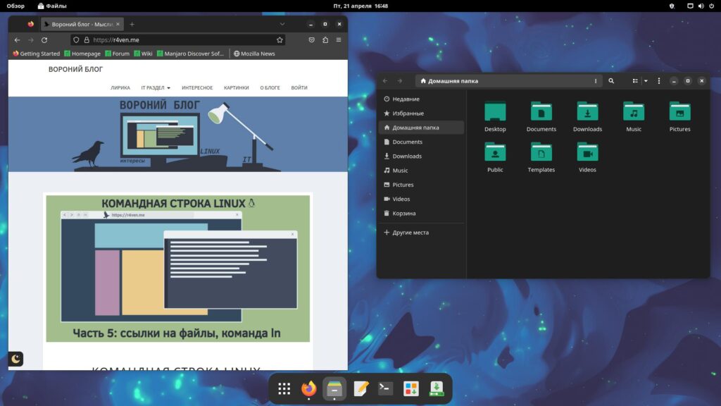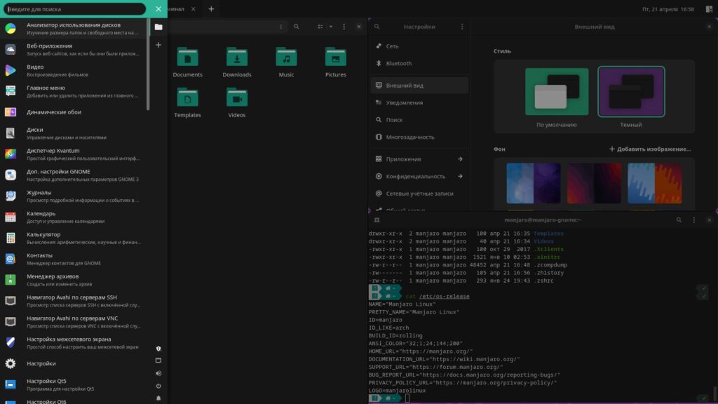 Файловый менеджер, терминал, настройки внешнего вида: тёмная тема