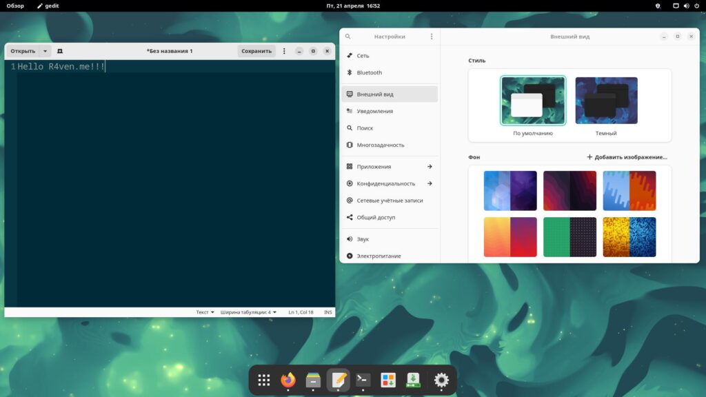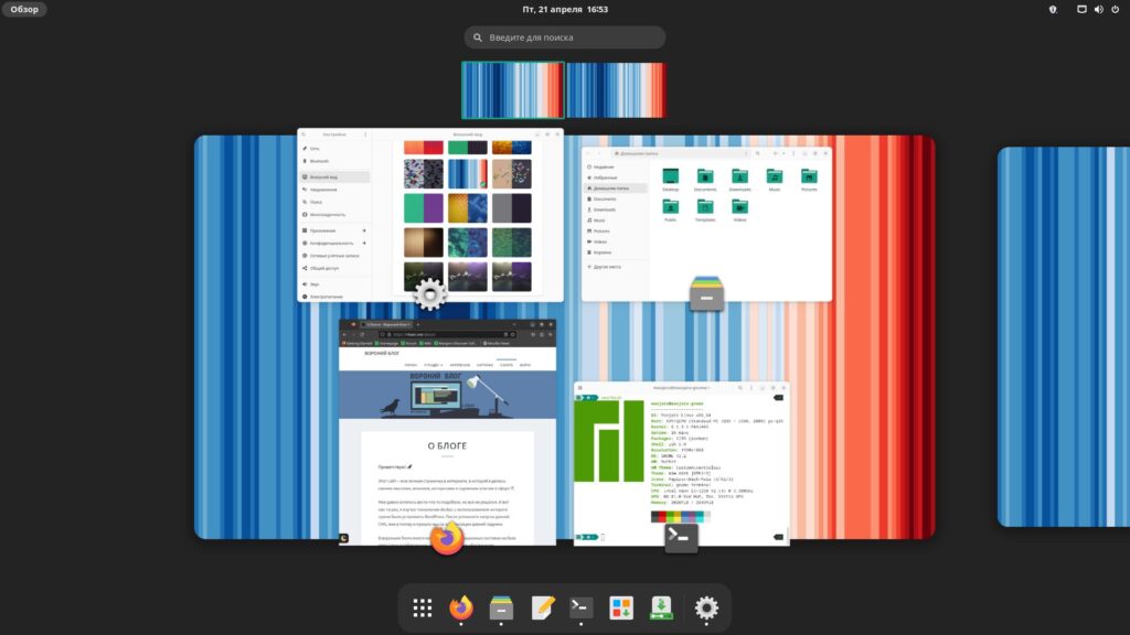 А вот это тайлинговый режим, реализованный с помощью расширения для Gnome — Material Shell. Как по мне, так это топ. Лично я предпочитаю тайлинговые оконные менеджеры. Ещё их называют мозаичными оконными менеджерами.
