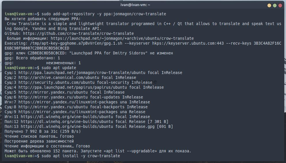 Для установки программы подключим официальный ppa репозиторий разработчика и установим последнюю версию Crow Translate. Открываем терминал и поочередно выполняем эти 3 команды, введя пароль после первой: