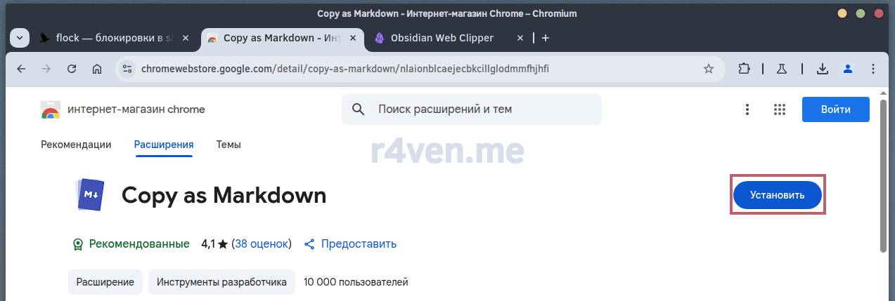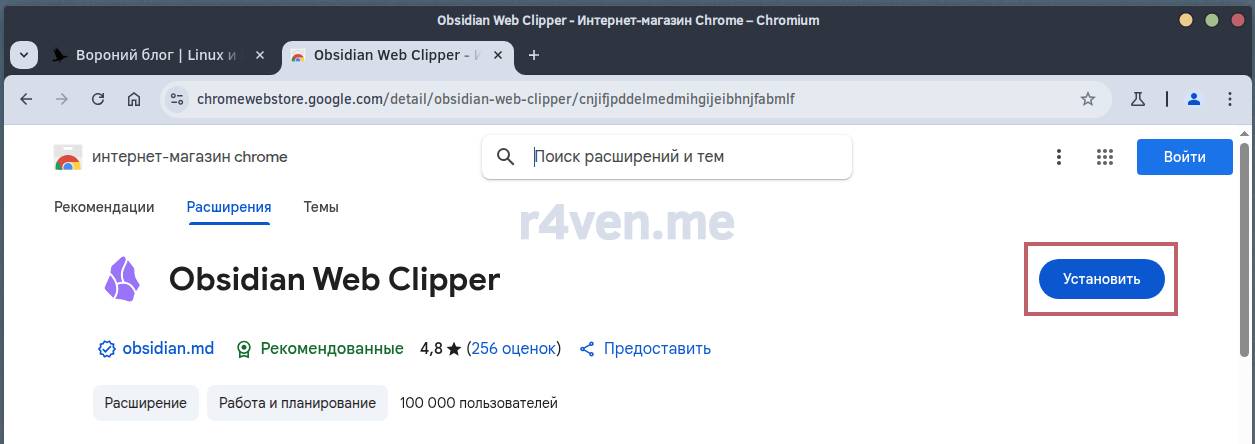 Идём на страницу загрузок Obsidian, прокручиваем страницу в самый низ и переходим по ссылке в магазин расширения вашего барузера. Я покажу на примере Chromium. Нажимаем Установить: