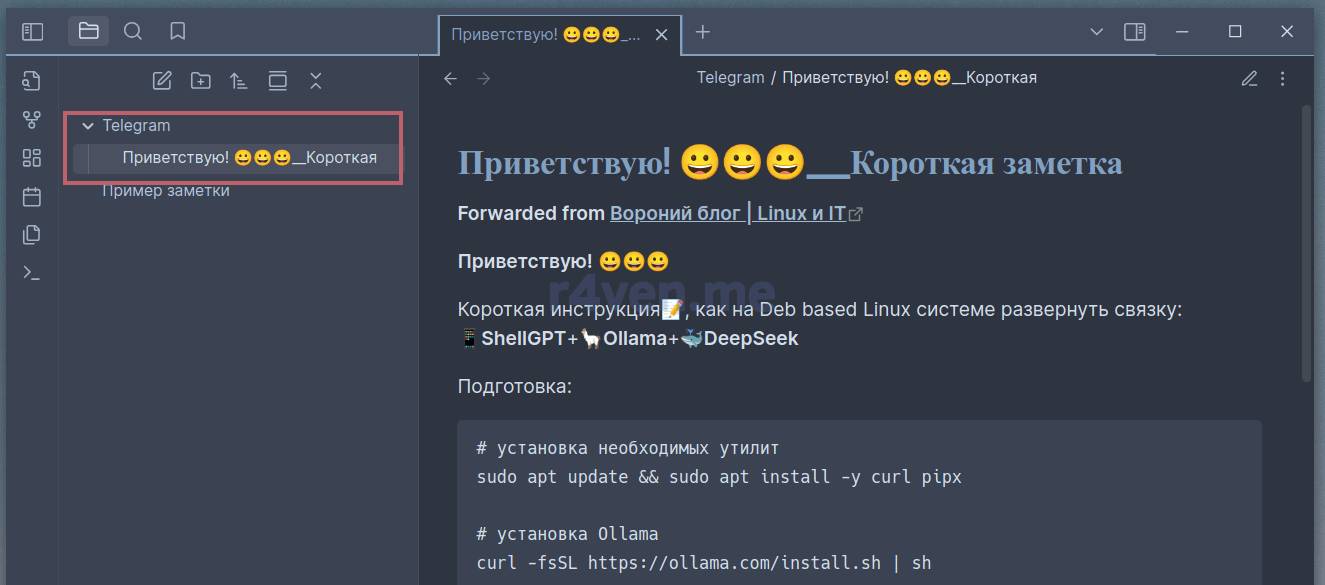По умолчанию в Obsidian создается раздел Telegram, в который складываются пересланные заметки: