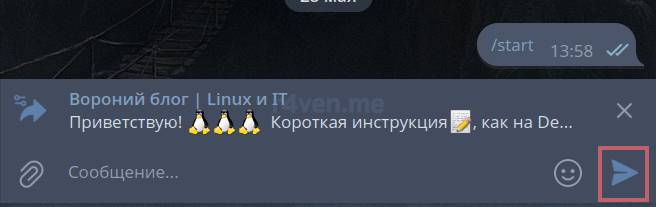 2) При нажатии на адрес бота попадём в чат с ним, тут нужно нажать «Старт»: