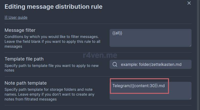 2) В разделе Message distribution rules меняю шаблон имени и путь заметок, параметр: Templeate file path: