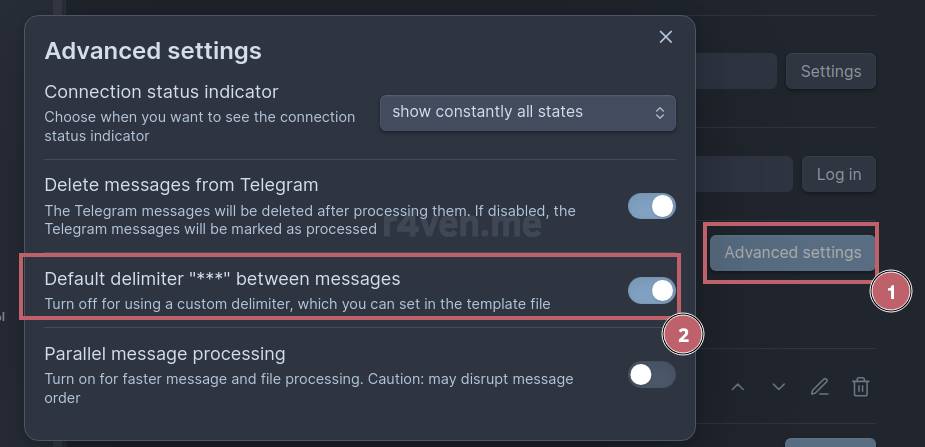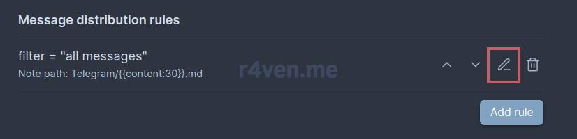 1) В Advanced settings включаю опцию удаления пересланного сообщения после его сохранения в Obsidian (чтобы не засорять чат):