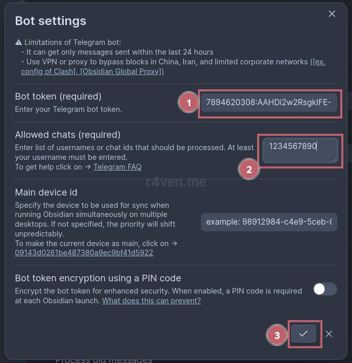 ⚠️Стоит отметить, что данная синхронизация работает пока Obsidian запущен на вашем ПК, подключённый к интернету. Если Obsidian потеряет связь с ботом, сообщения пересланные более 24 ч. назад в Obsidian не попадут.