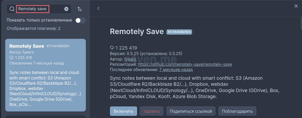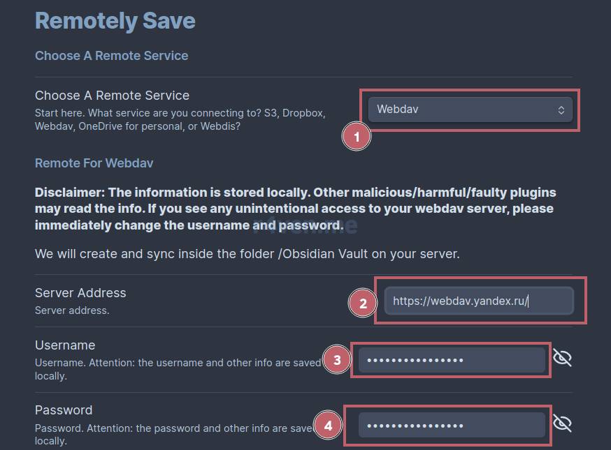 Плагин Remotely save позволяет настроить синхронизацию с облачными хранилищами (Google Drive, Yandex Disk, Nextcloud и пр.), как публичными, так и self hosted. Я покажу пример настройки синхронизации с Yandex Disk по протоколу WebDav.