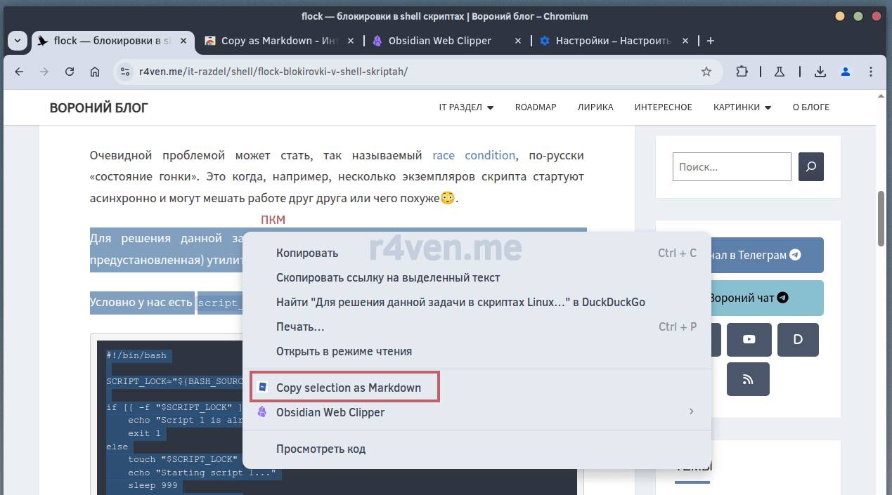 Теперь при выделении текста на странице в контекстном меню через ПКМ будет доступна кнопка Copy selection as Markdown: