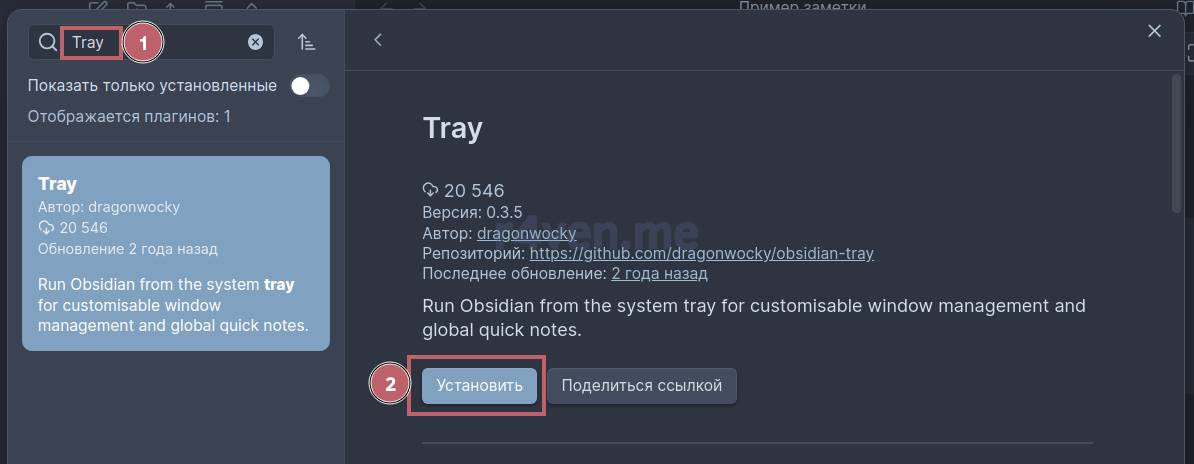 По умолчанию функционала системного трея в Obsidian нет. Поэтому аналогичным образом ищем плагин в поиске: