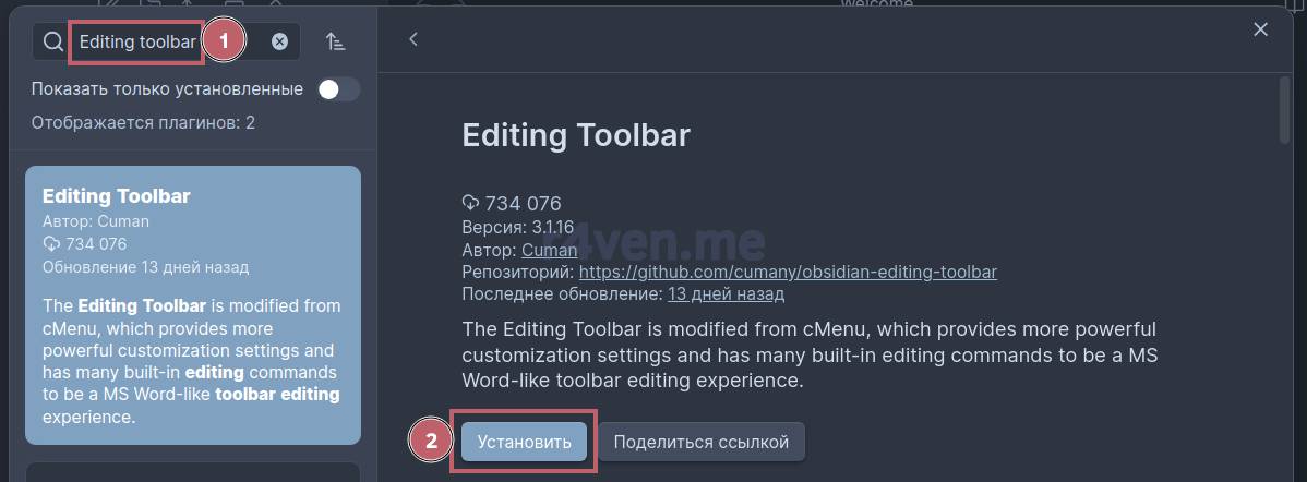 В строке поиска вводим название Editing toolbar и нажимаем Установить:
