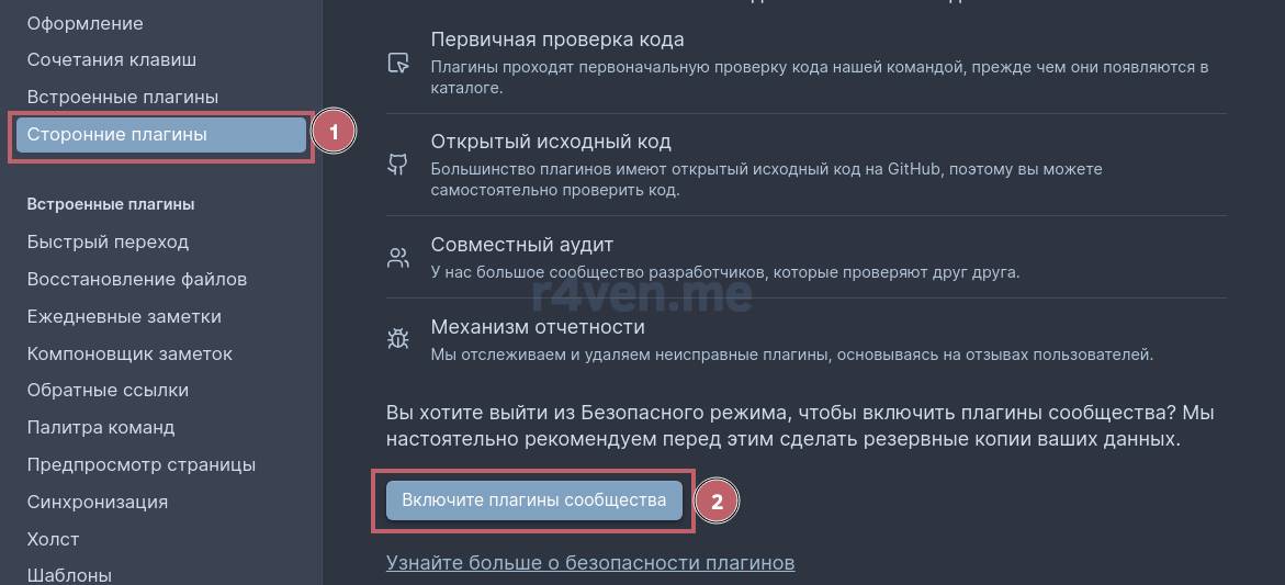 Плагины сообщества — то, ради чего я отдал предпочтение данной программе для ведения личной базы заметок. Перед установкой сторонних плагинов необходимо активировать данный функционал: Настройки — Сторонние плагины — Включить: