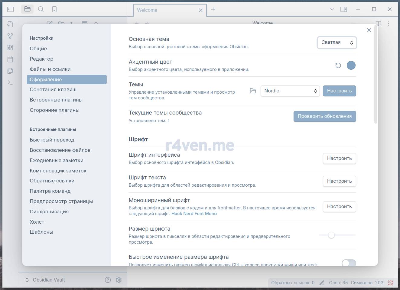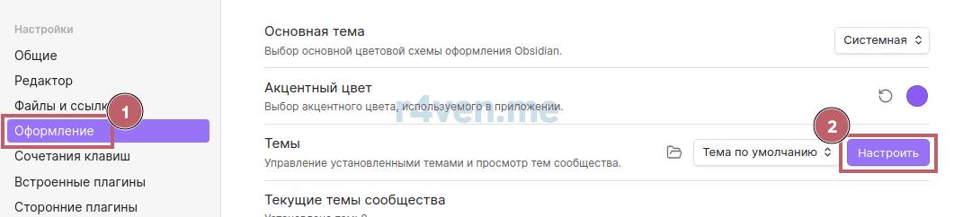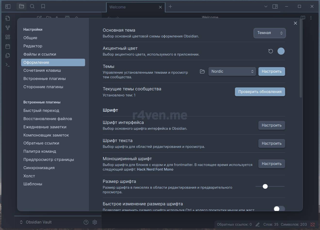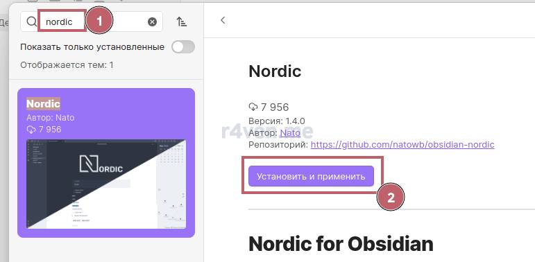 Obsidian поддерживает большой список тем оформления интерфейса. Покажу, как установить мою любимую тему. В настройках переходим в Оформление — Темы — Настроить. В поиске вводим Nordic, затем нажмите Установить и Применить: